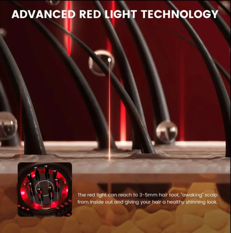 Red light penetrates the scalp (630-660nm wavelength) and increases blood flow to the hair follicles. This stimulates inactive follicles and encourages new hair growth, especially in areas affected by thinning or hair loss.